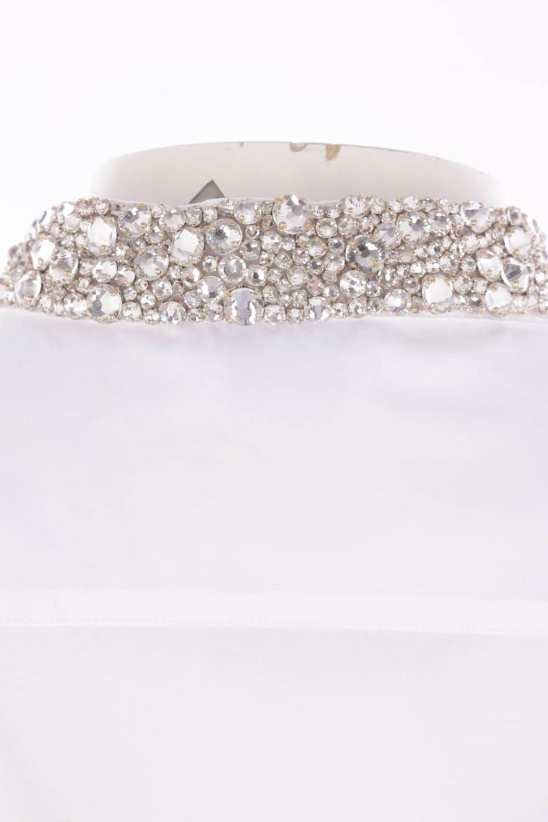 Alexander McQueen shirt made of white cotton poplin. Featuring a mandarin collar with crystal embroidery, front button closure, long sleeves with buttoned cuffs, and a rounded hem.