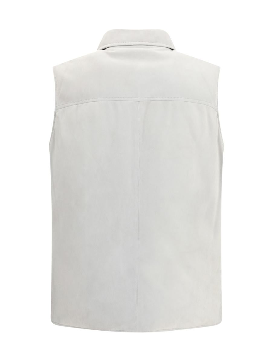 BRUNELLO CUCINELLI'S PADDED LEATHER VEST IS A SOPHISTICATED GARMENT THAT COMBINES ELEGANCE AND FUNCTIONALITY. MADE OF SOFT LEATHER, IT FEATURES A SNAP-BUTTON CLOSURE AND A SHIRT-STYLE COLLAR THAT ENHANCES ITS TAILORED DESIGN. CHEST BREAST POCKET AND SNAP BUTTON WELT POCKETS ADD PRACTICALITY WITHOUT SACRIFICING STYLE. INSIDE, TWO BUTTON-FASTENING POCKETS AND A PEN POCKET COMPLETE THE STRUCTURE. FINE GOOSE DOWN FILLING PROVIDES WARMTH AND COMFORT, MAKING THE VEST IDEAL FOR COLDER SEASONS.