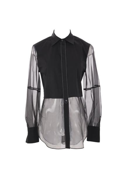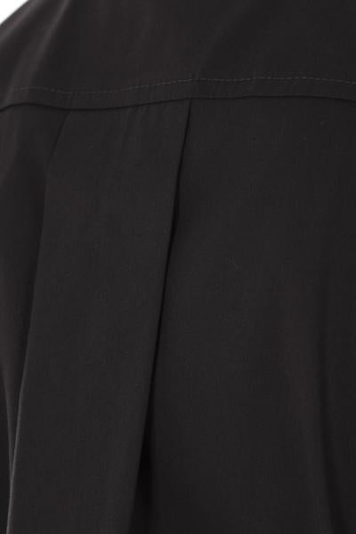 Brunello Cucinelli shirt crafted from black Crispy stretch cotton and silk poplin. It features a classic collar, concealed front button closure, long sleeves with buttoned cuffs, and a rounded hem that is longer at the back. The design is completed with embroidered trims accented with rows of sparkling jewelry detailing.