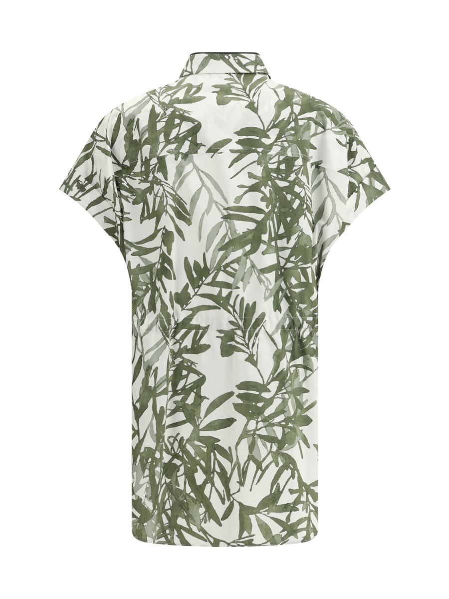 LONG SHIRT FROM BRUNELLO CUCINELLI, FEATURING A CLASSIC COLLAR EMBELLISHED WITH THE BRAND'S ICONIC SHINY JEWELS. THE FRONT CLOSURE WITH HIDDEN BUTTONS GIVES A CLEAN AND ELEGANT LOOK, WHILE THE ELASTICATED WAISTBAND ENSURES A COMFORTABLE AND MODERN FIT. THE TWO PATCH POCKETS ON THE FRONT WITH FLAPS ADD FUNCTIONALITY AND STYLE. THE LEAF PRINT COMPLETES THE DESIGN, MAKING THIS UNIQUE AND SOPHISTICATED GARMENT PERFECT FOR A REFINED AND CONTEMPORARY LOOK.