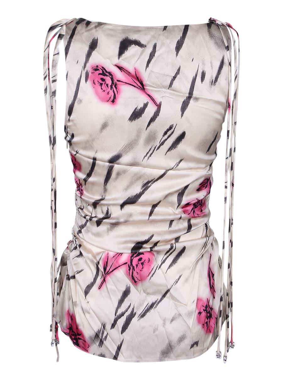 Sleeveless satin top with floral print. Side lace-up adjustment. Square neckline.