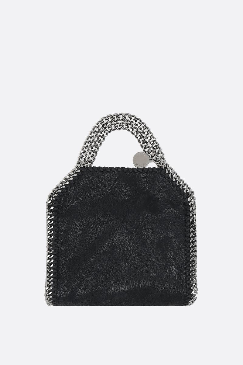 Stella McCartney tote bag crafted from black Shaggy Deer eco-material. It features ruthenium-tone hardware, an internal magnetic button closure, double handles, and a chain shoulder strap. The pink logo fabric-lined interior includes a slip pocket. The design is completed by the signature Stella McCartney logo charm.