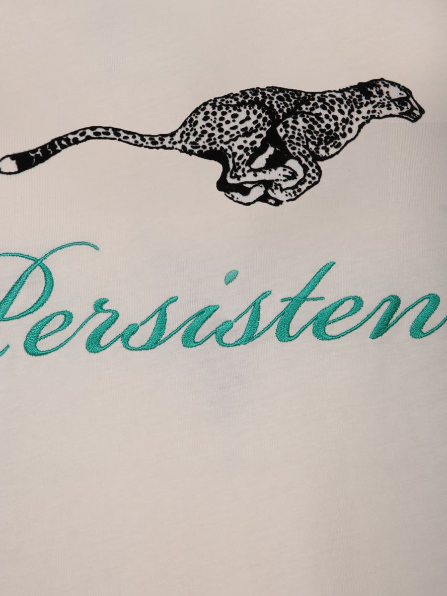 This Wales Bonner T-shirt features a bold design with its contrasting green collar and iconic leopard print with the 'Persistence' text. Perfect for an everyday look that stands out.