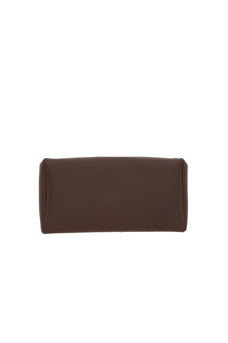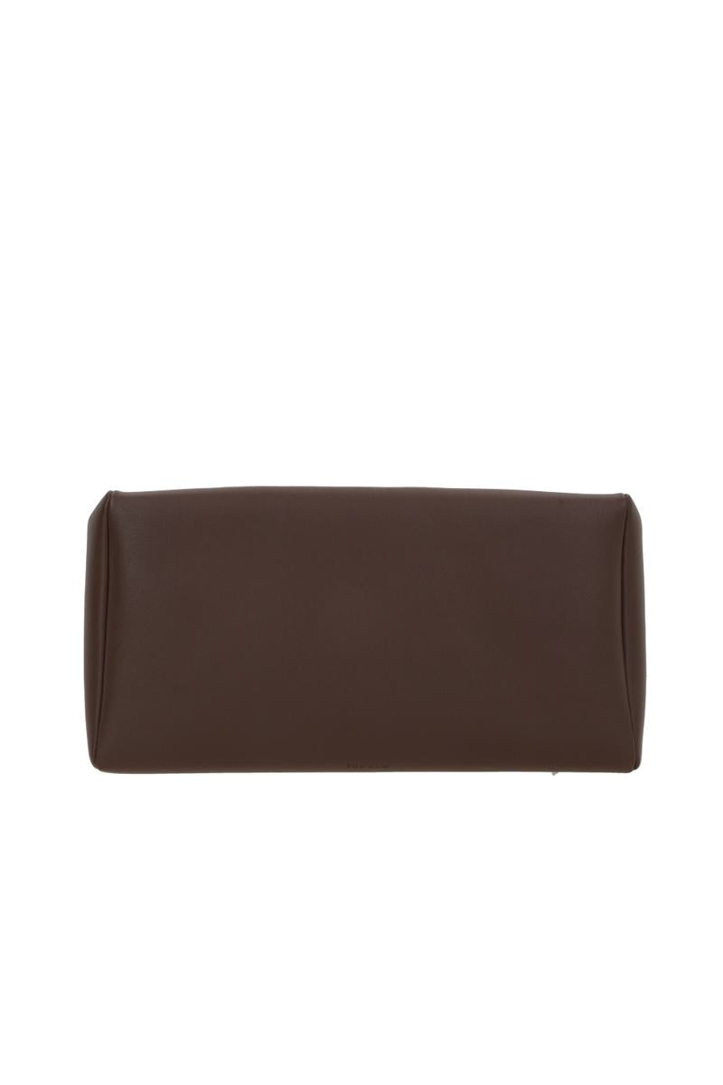 The Row clutch made of dark brown nappa leather with an embossed logo lettering on the front. Featuring silver-tone hardware, a zip closure, and a nappa-lined interior in a matching tone with two card slots.