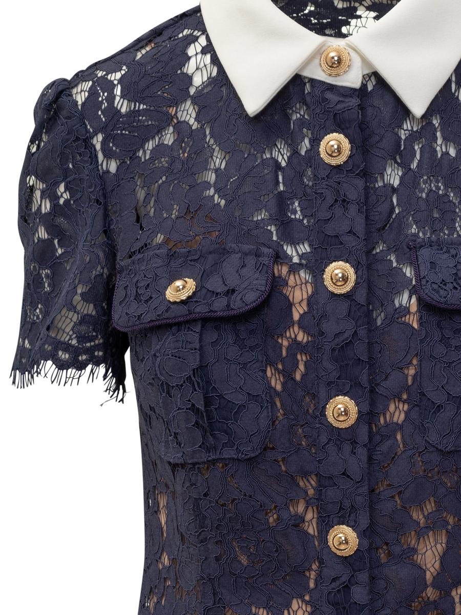 Self-Portrait signature navy blue lace midi dress with gold buttons, contrasting white collar and front pockets.