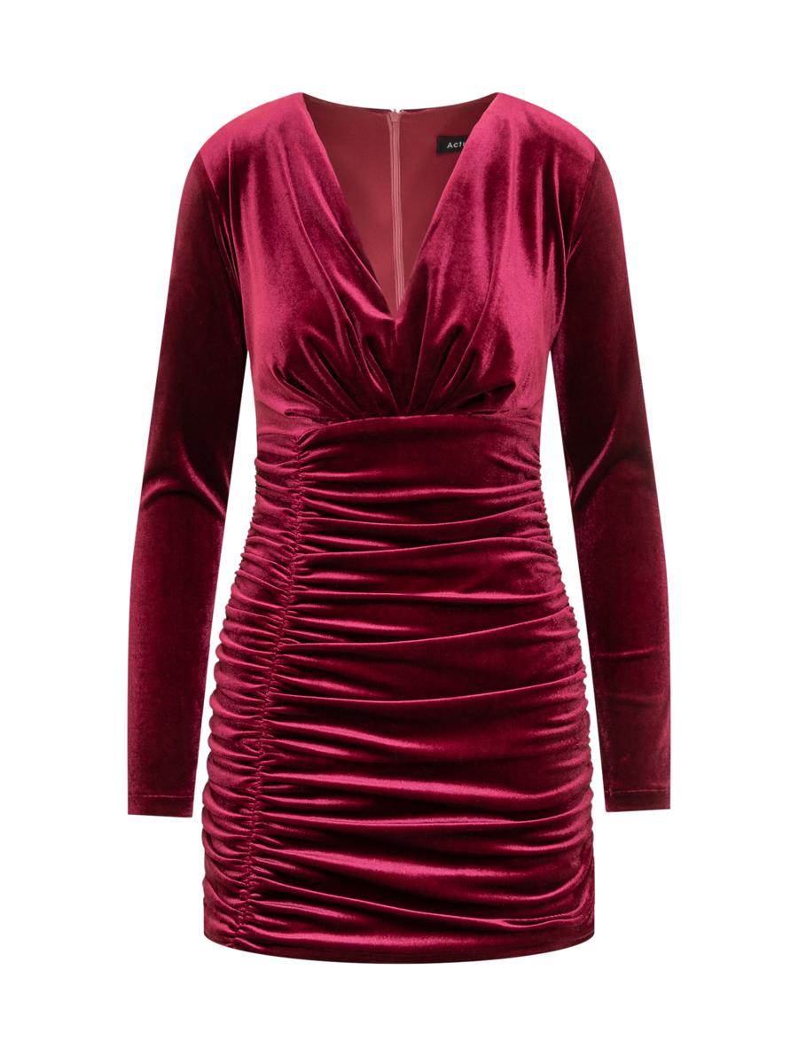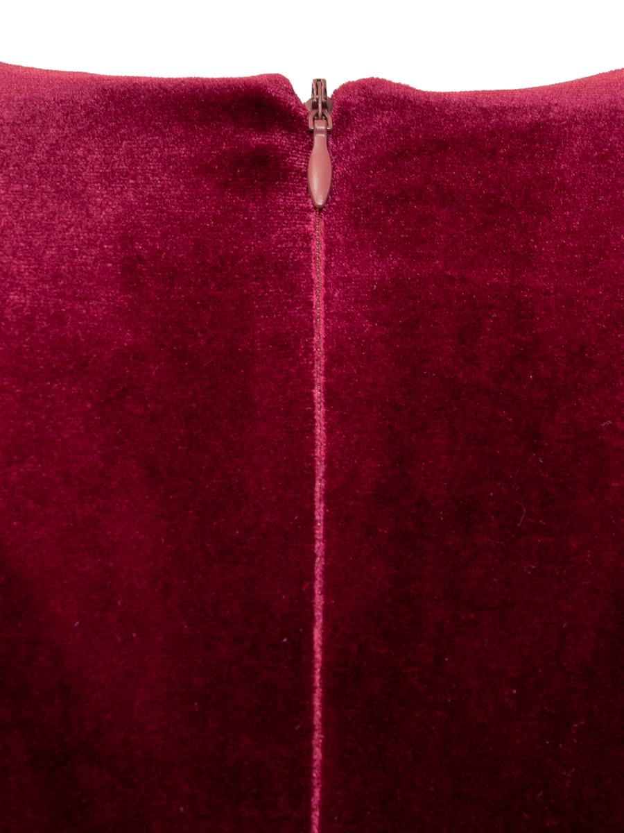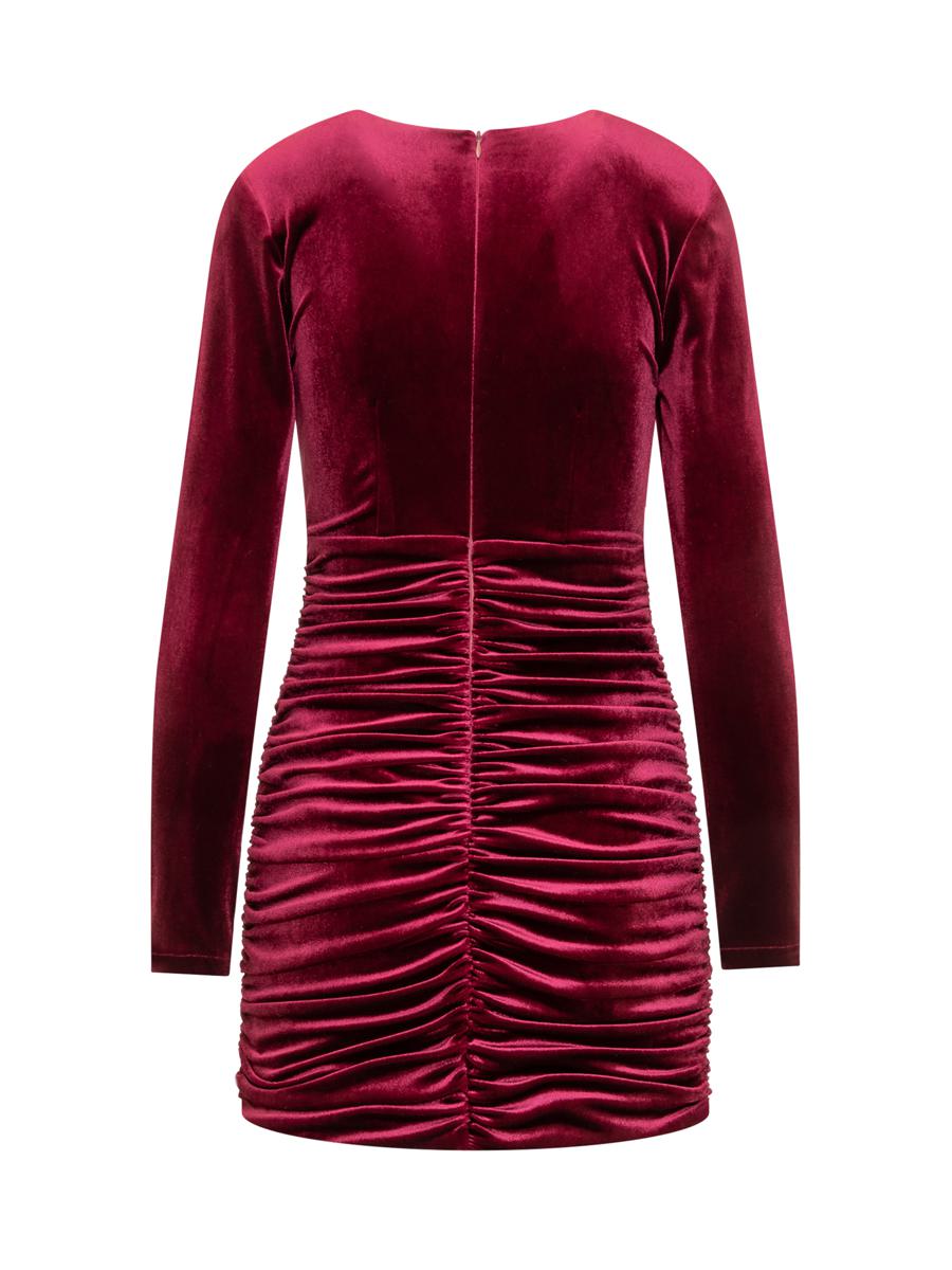 Midi dress with long sleeves. V-neck. Back zipper closure. Curlicues at front. Velvet effect.