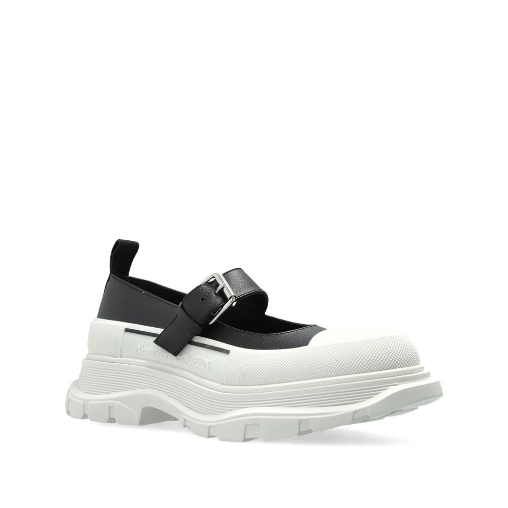 Black contrasting white sole buckle fastening textured rubber outsole platform design