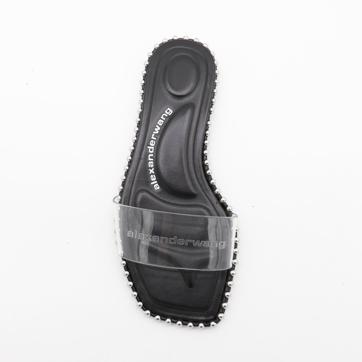 Black flats from Alexander Wang featuring square open toe, open back, slip-on style, trasparence upper band, studs, branded insole and leather sole.