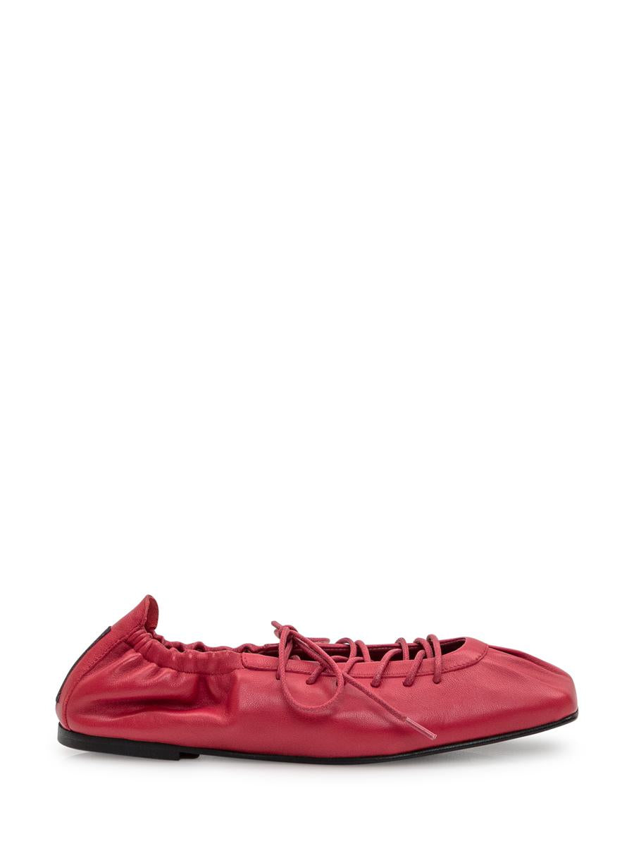 Red ballerina with a classic shape and no heel. Made of soft shiny leather decorated with laces covering the instep. Silhouette is simple and clean with a rounded toe.