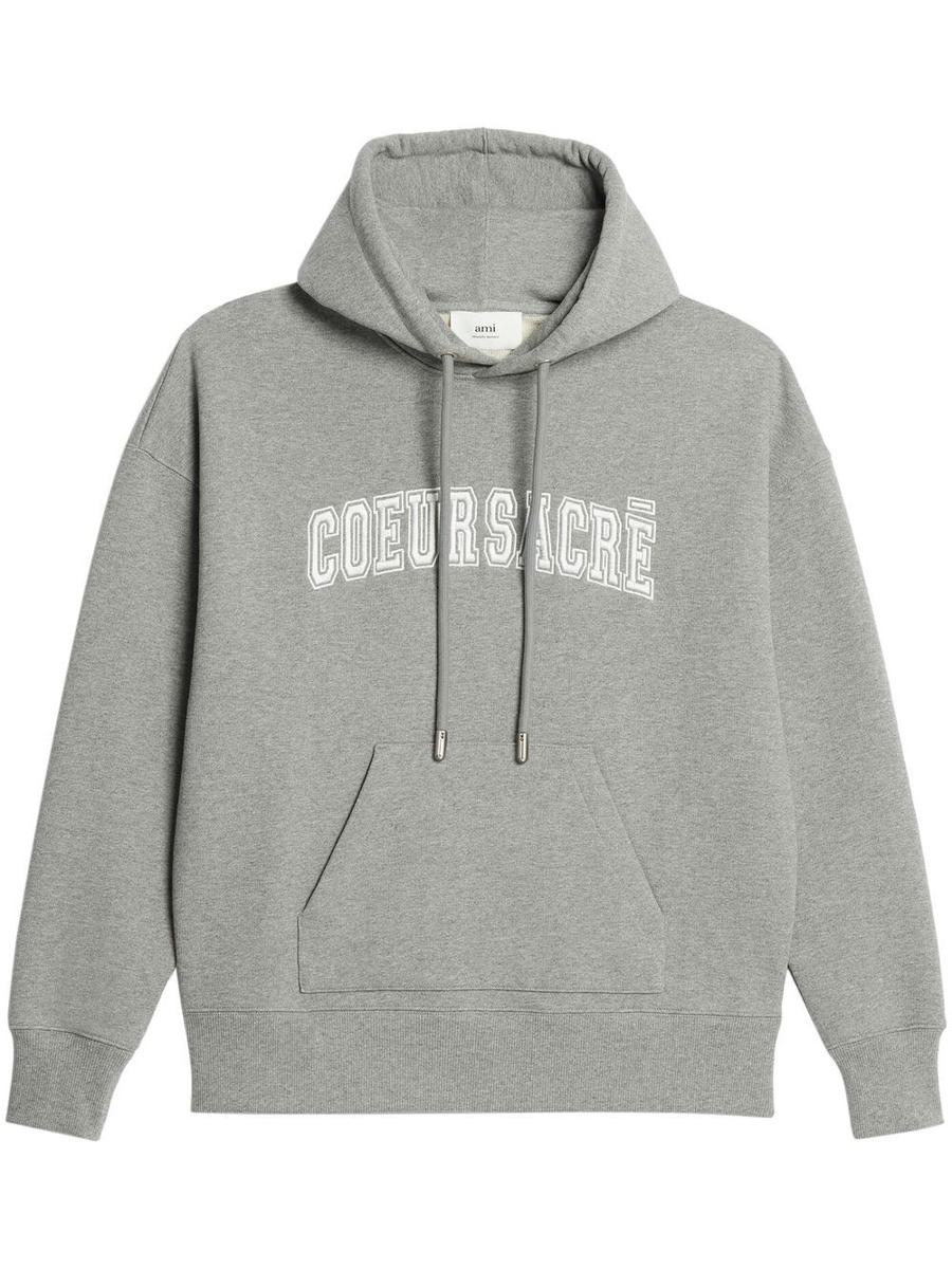 Coeur Sacré embroidered hoodie from AMI Paris featuring grey, cotton, embroidered slogan, drawstring hood, long sleeves, front pouch pocket and ribbed cuffs and hem.