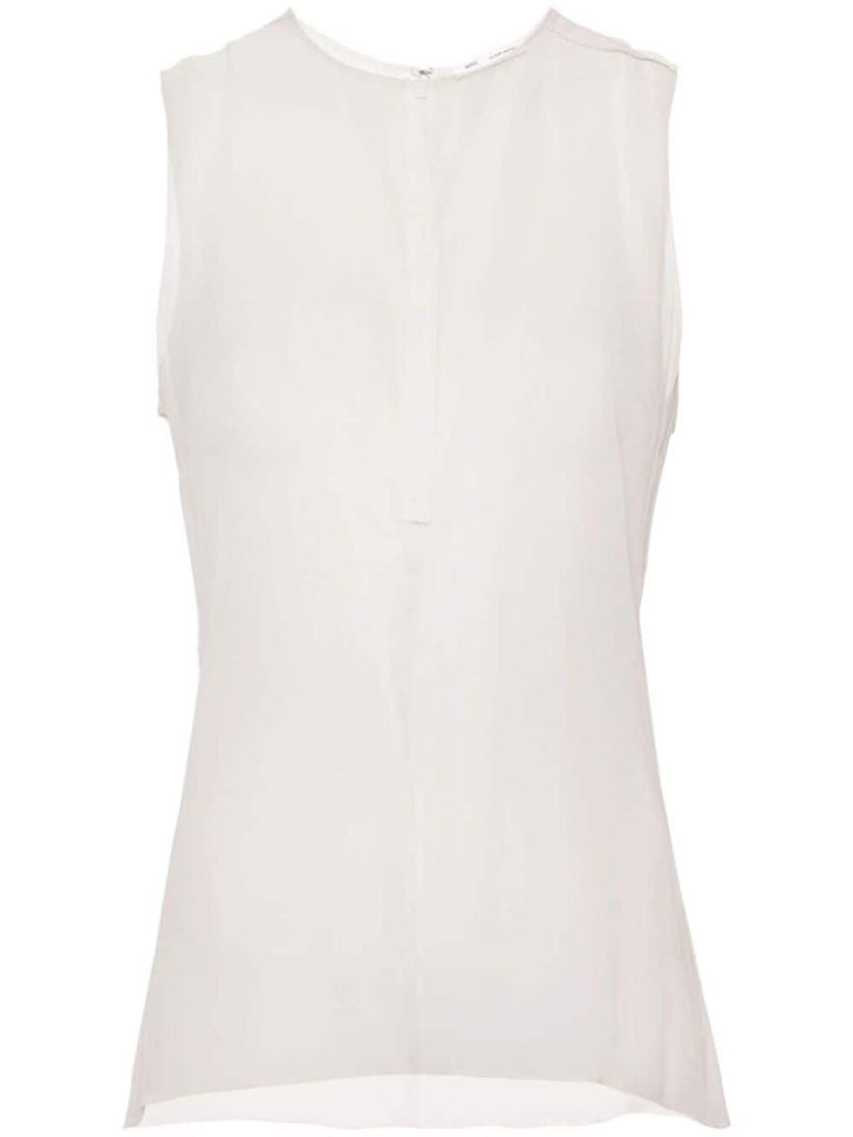 white silk semi-sheer construction round neck sleeveless straight hem concealed rear hook and zip fastening