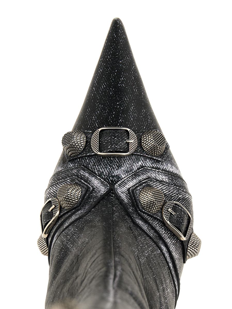 'Cagole' boots in denim print nappa leather, antiqued silver studs and buckle detail, heel, side zip closure
