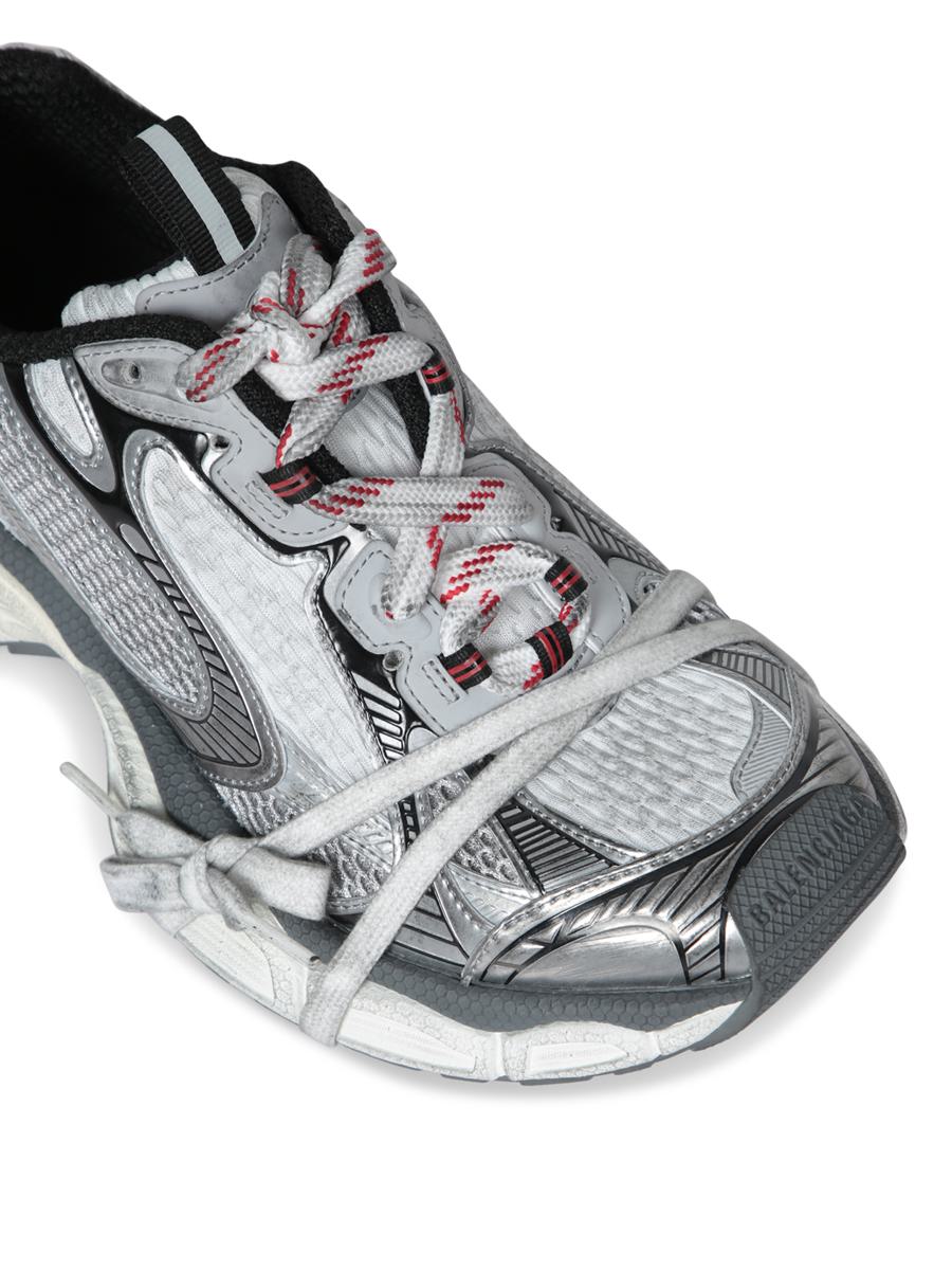 Sneakers with mesh detailing, sturdy midsole, adjustable laces. Silver-colored design with black and red accents.