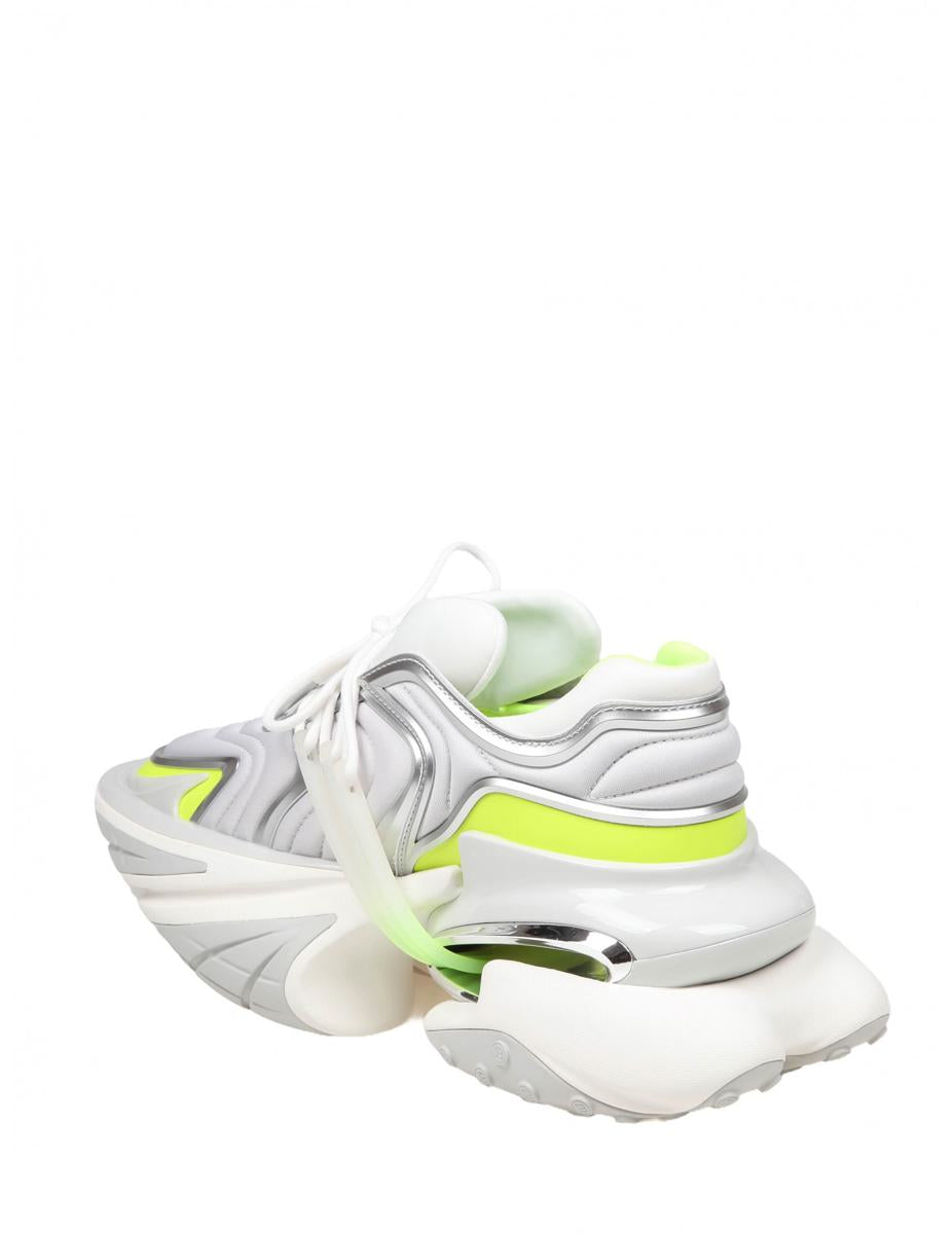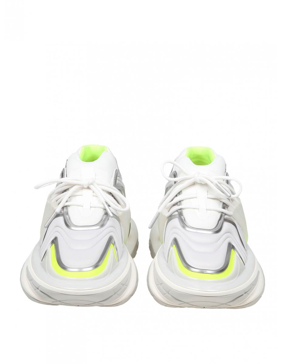 Multi-material model White and yellow color Quilted upper with wave details Lace-up closure with silver finish Balmain logos embossed on the tongue and heel, and embossed on the side Hollow cushion sole, B studs Neoprene lining Leather insole Sole height: 7 cm Main Materials: 92% Polyester 8% Spandex