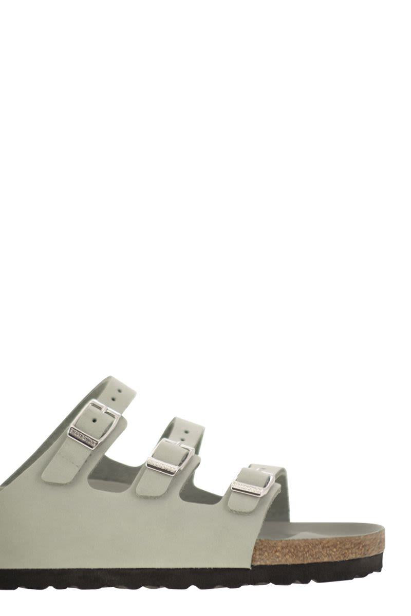 BIRKENSTOCK Florida is the sandal for people who are always on their feet. This model with three straps holds the foot securely and offers optimal comfort. The upper is made of high-quality, soft nubuck leather, which is fantastic with its natural, rustic look. - Anatomical cork and latex footbed - Upper: nubuck leather - Insole: suede leather - Outsole: EVA - Details: three individually adjustable metal buckle straps - Narrow fit: Narrower fit for slender feet DESIGNER ID: 1029450 PURE SAGE