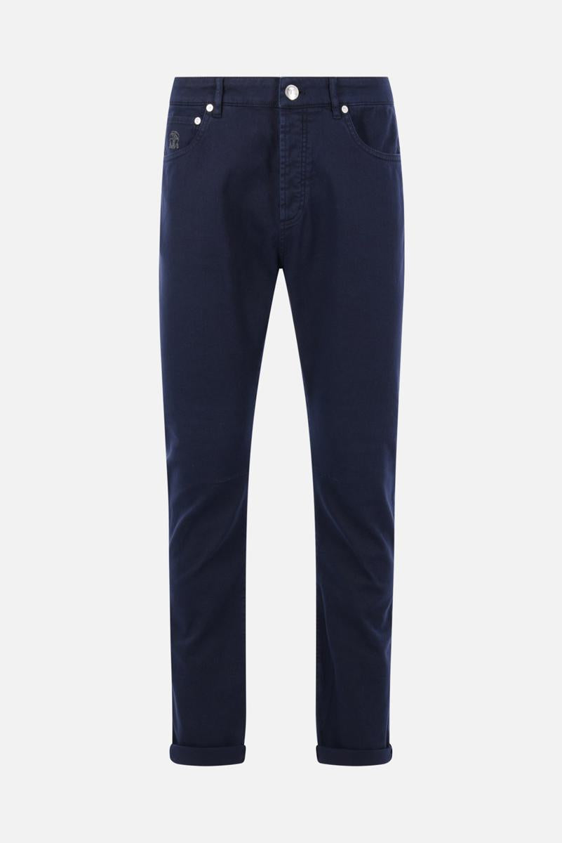 Brunello Cucinelli jeans made of stretch blue cotton denim with Solomeo logo embroidery on the front. Featuring a front closure with metallic buttons, belt loops, five classic pockets and a cuffed hem.