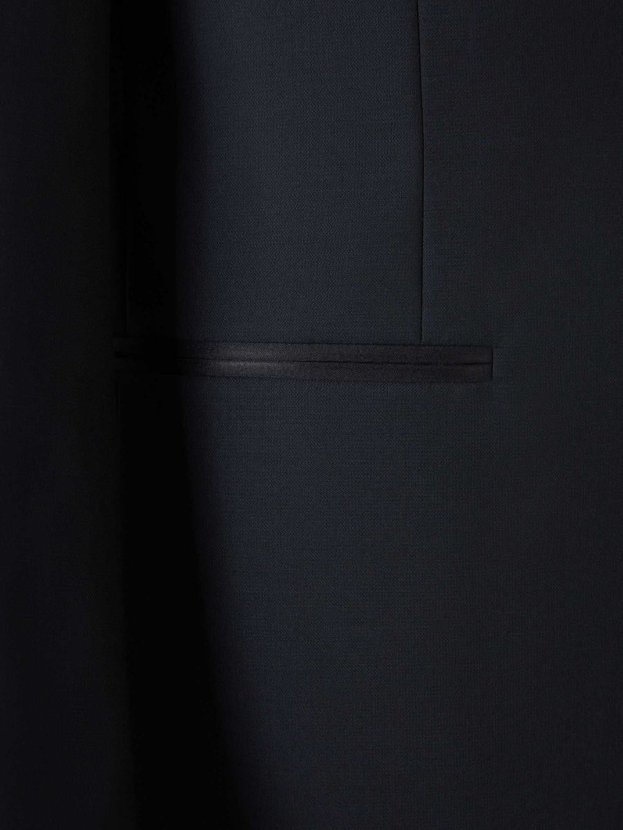 Tuxedo by Canali Classic fit Wool fabric with silk lapels Plain fabric Black color Peak lapel Straight one-button fastening Fitted silk sash Botón forrado en seda Classic waistband Lined buttons Side silk trim Two darts You can book a private appointment with us so that we can take your measurements and customize it for you.