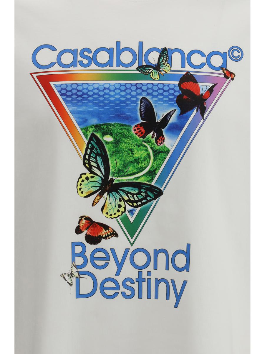 THE CASABLANCA TENNIS CLUB BEYOND DESTINY T-SHIRT IS MADE OF SOFT PRINTED COTTON AND REINTERPRETED THROUGH A DIGITAL LENS THAT COMBINES GRAPHIC ELEMENTS AND PICTORIAL MOTIFS. THE ILLUSTRATION RECALLS THE AESTHETIC OF THE FASHION HOUSE'S CLASSIC SOUVENIR SHIRTS, WITH HAND-PAINTED BUTTERFLIES AND DREAMLIKE LANDSCAPES EVOKING TROPICAL ISLAND ATMOSPHERES. THE PATTERN FEATURES SHORT SLEEVES, A RIBBED CREW NECK AND A COMFORTABLE FIT, PERFECT FOR ELEVATING CASUAL LOOKS WITH AN ARTISTIC, CONTEMPORARY TWIST.