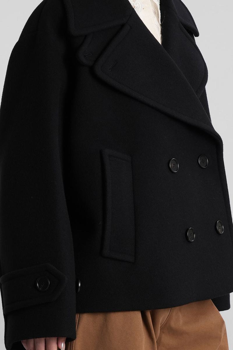 in black wool, large revers, long sleeves, double breasted closure, side pockets, buttons cuff, 80% wool, 20% polyamide, Made in Slovakia