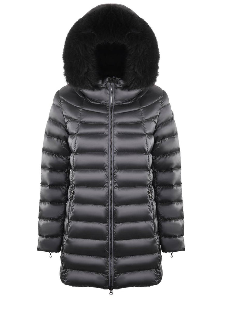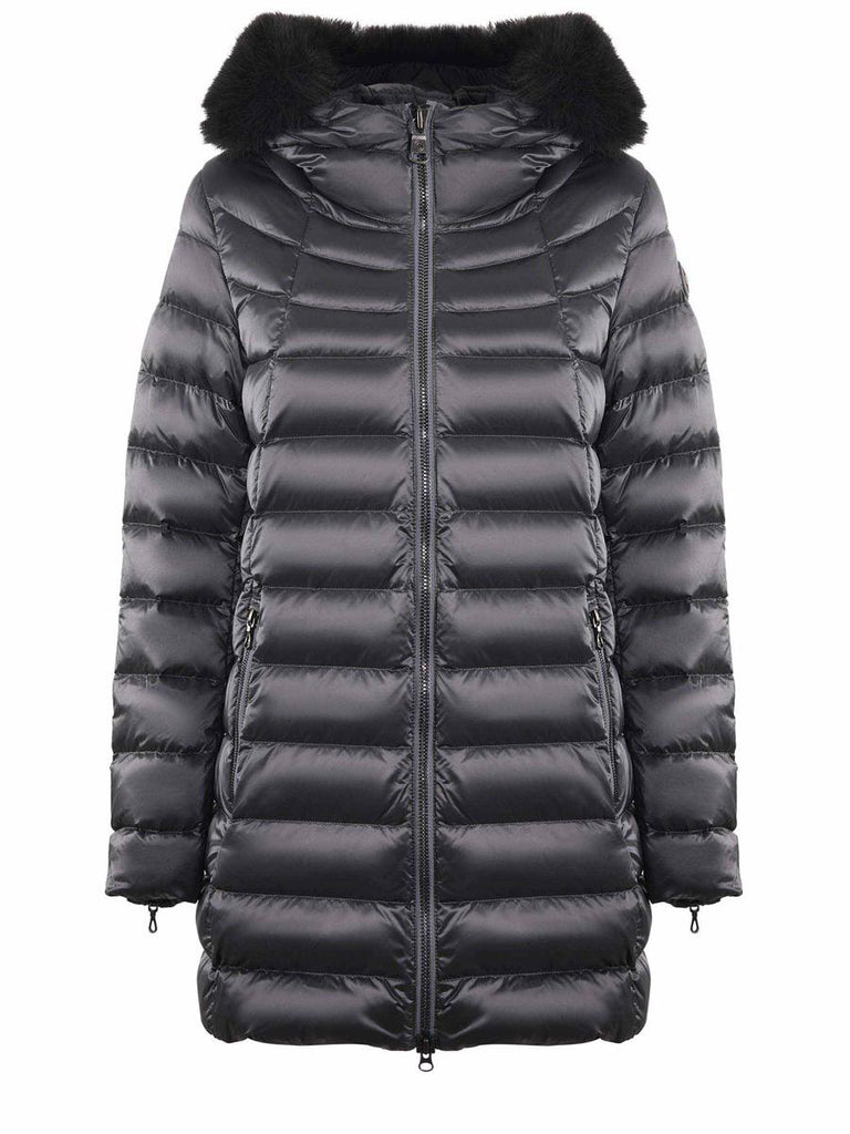 Colmar Originals down jacket in satin and quilted nylon. Medium length, oval line. Padded with goose down. Hood with removable real fur trim. Double slider zip closure. Zip pockets. Logo patch applied on the left sleeve. Size in photo 40