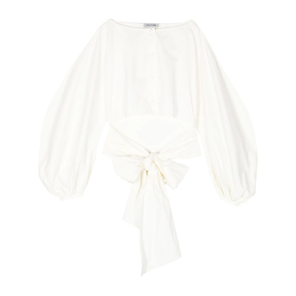 Off-white poplin texture boat neck front button fastening fabric-covered buttons long batwing sleeves gathered buttoned cuffs cut-out detailing tied waist