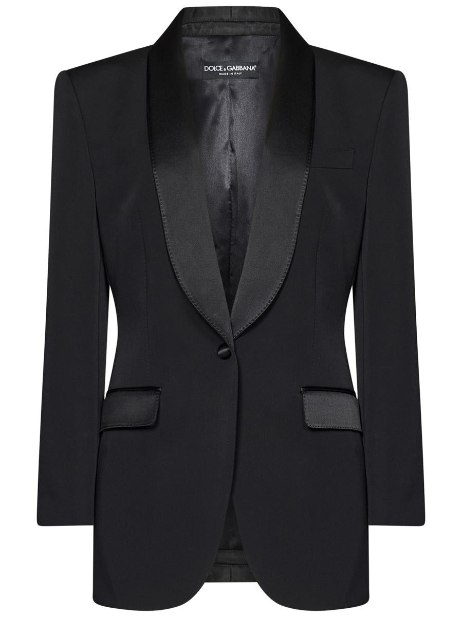 Silk duchess shawl collar; long sleeves, structured shoulders, four-button cuffs
