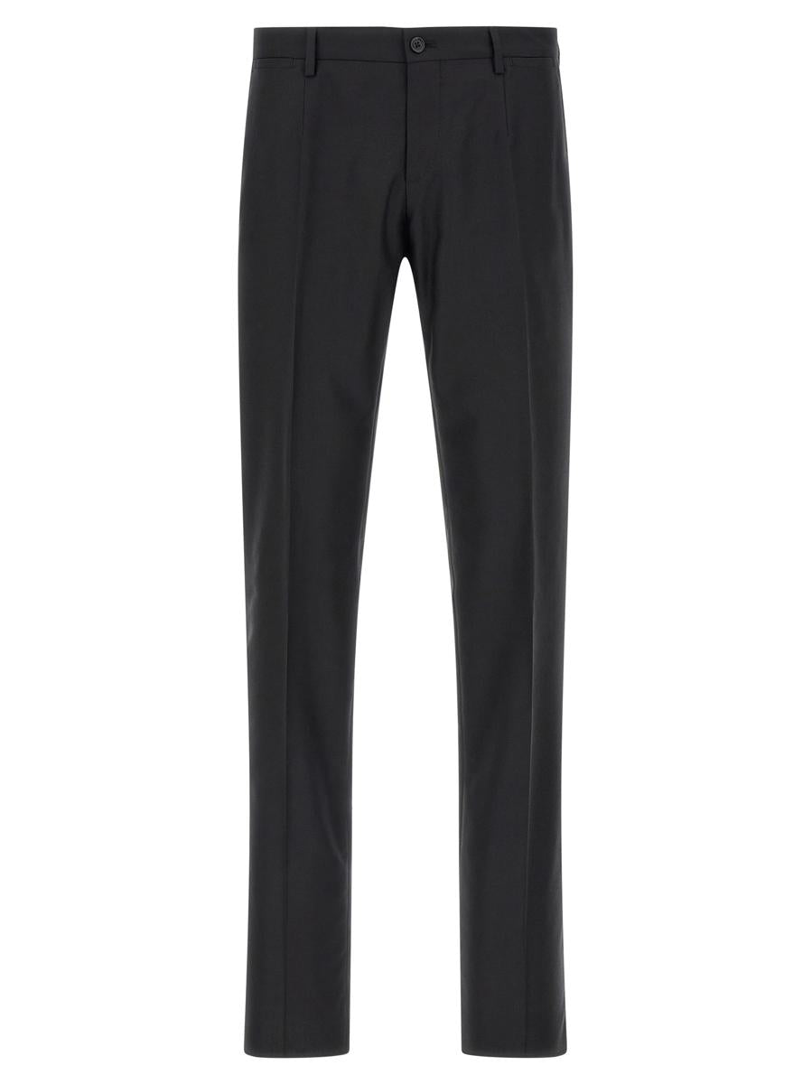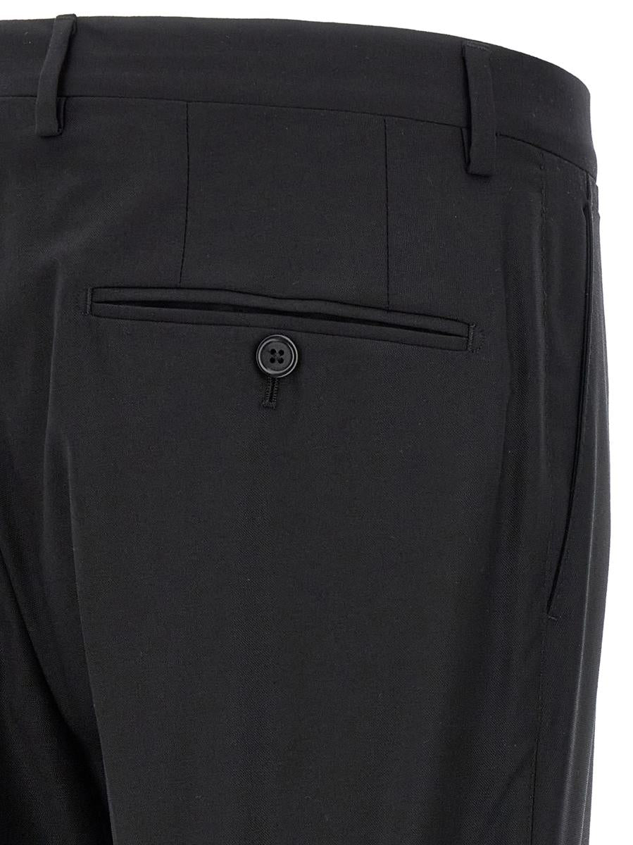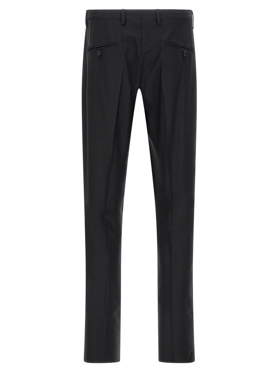 Single-breasted 'Martini' wool and silk canvas dress, jacket with peak lapels, pockets, back central split, long sleeves with padded shoulders, straight trousers, zip, button and hook closure, pockets