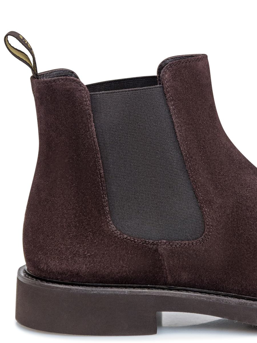 Brown suede Chelsea ankle boot with elastic at sides. Round toe. Platform height: 3