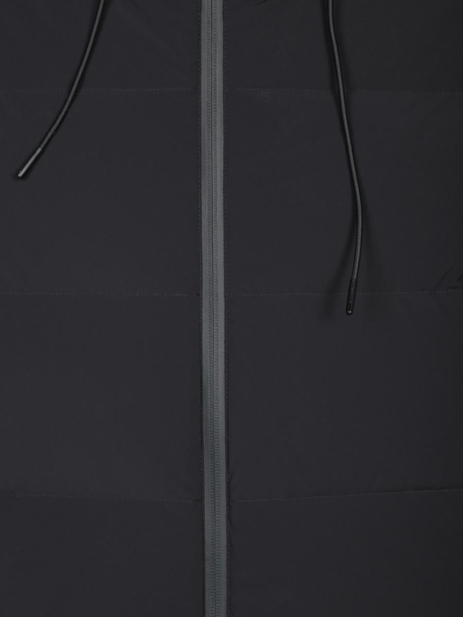 Down-filled jacket with hood, front zipper closure, side zipper pockets.
