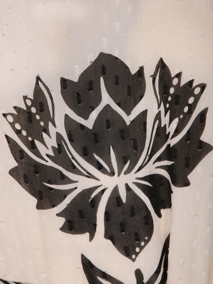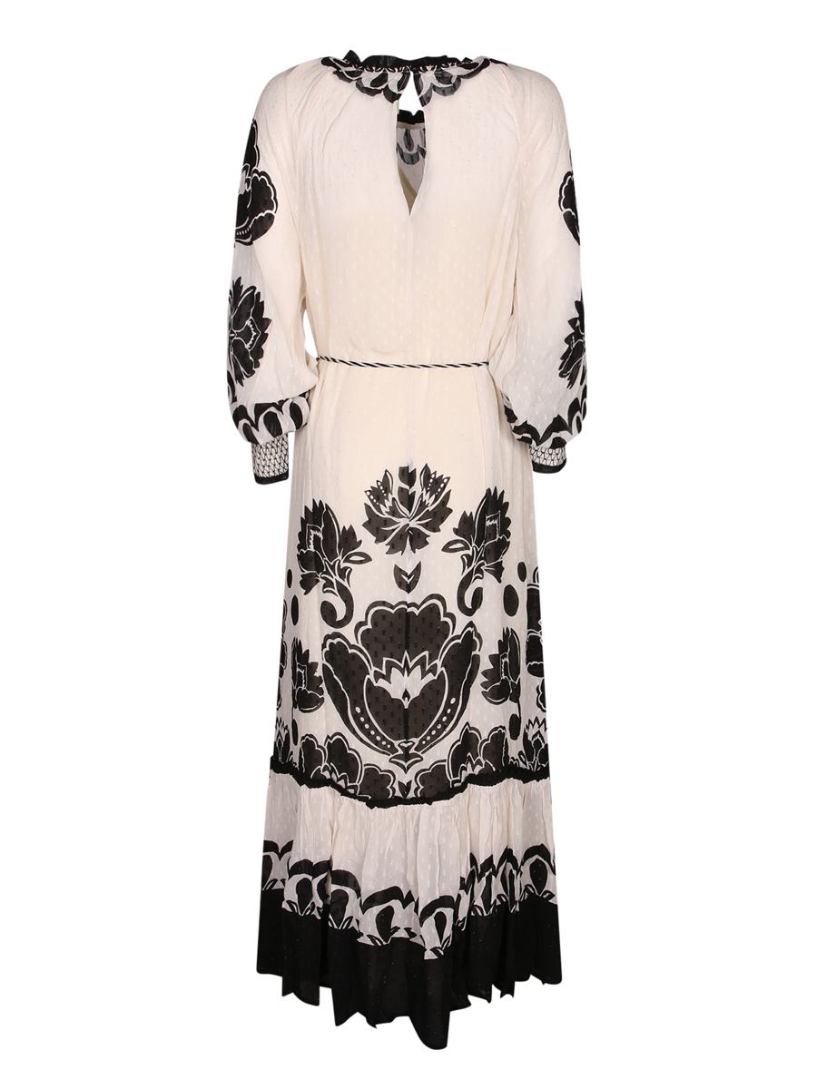 Long dress with long sleeves. Round neckline with cut-out details. Black floral pattern on a cream base.