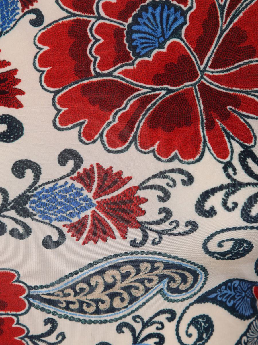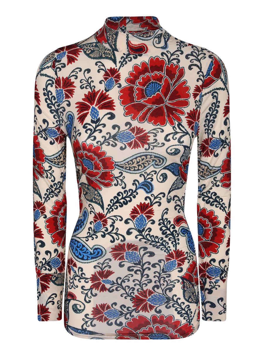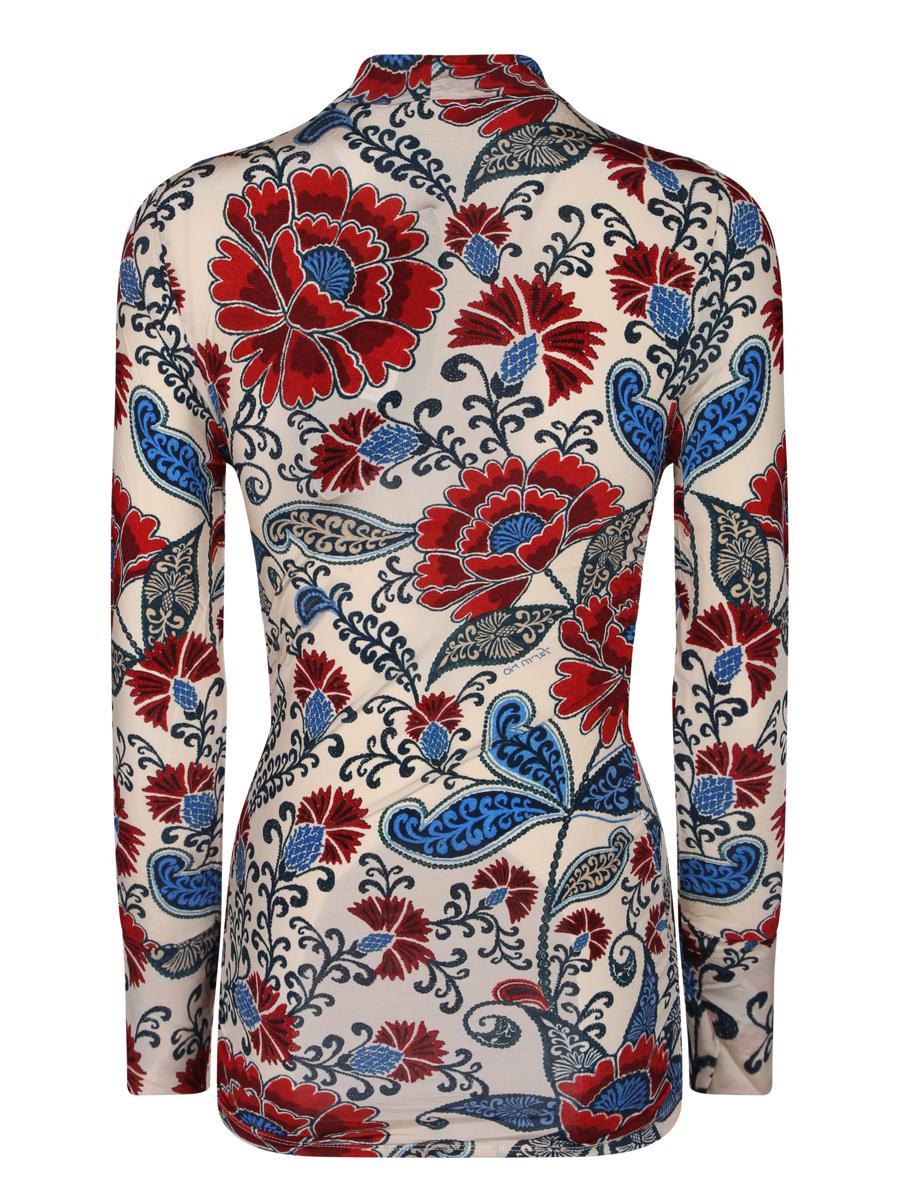 Long sleeve blouse in satin fabric. High neck and intricate floral pattern.