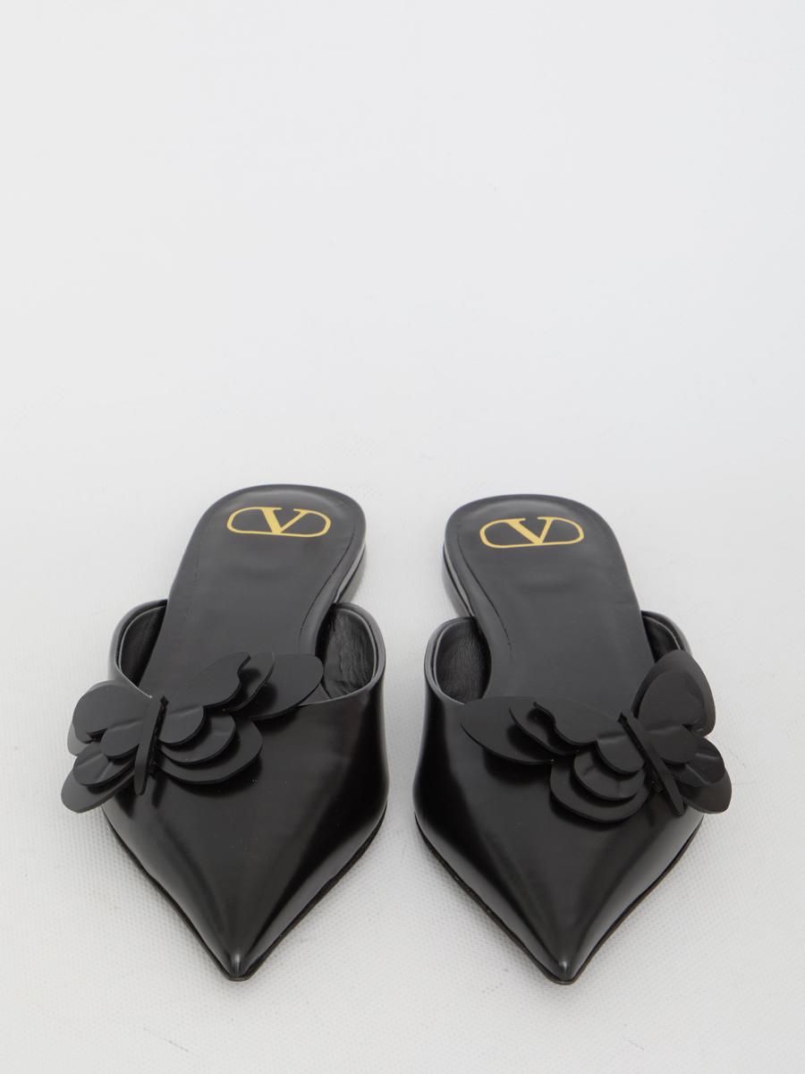 Valentino Garavani flat mules in black leather with pointed design and butterfly appliqué.