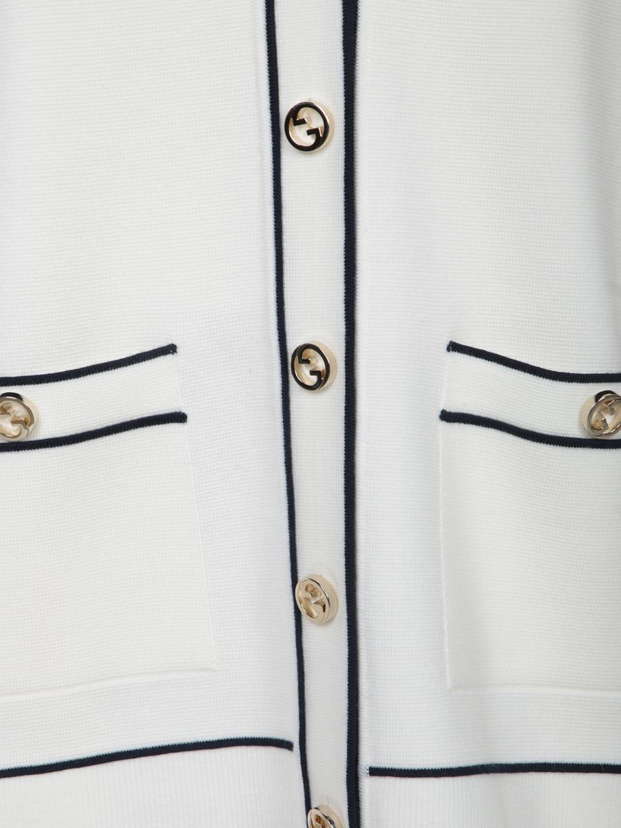 Cashmere cardigan with contrasting dark blue edges. Features decorative golden front buttons and patch pockets.. This elegant Gucci white cashmere cardigan is accented with navy blue trims and distinctive logo buttons, offering a refined mix of understated luxury and preppy style