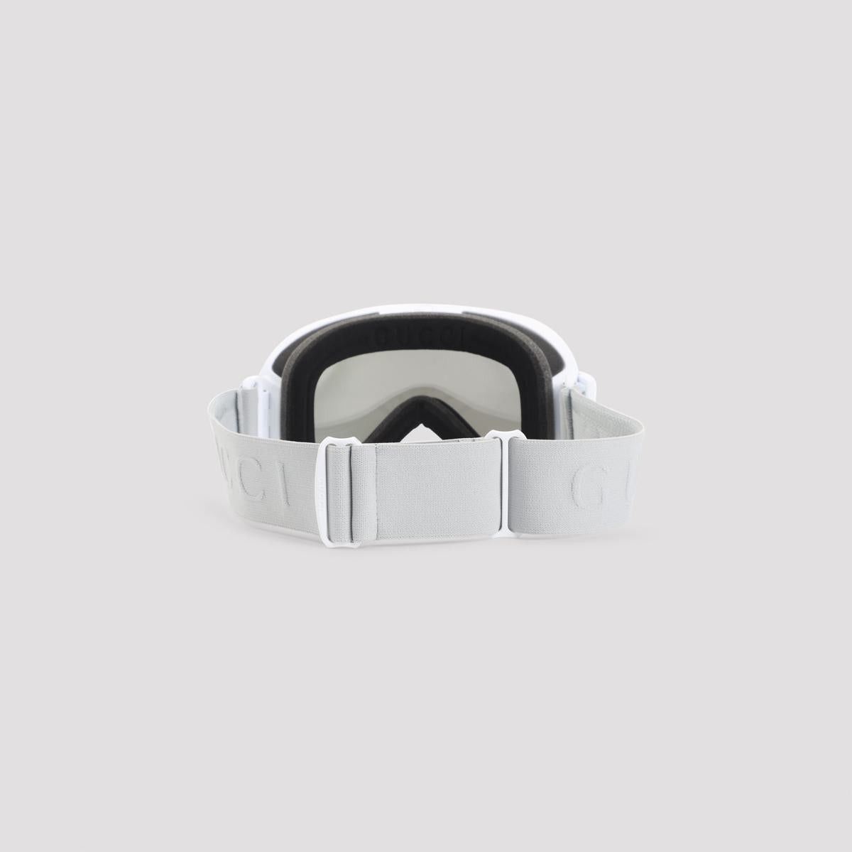 Gucci White Acetate Sunglasses. White acetate sunglasses, mask design, tonal temples, top signature embossed GG-logo, silver lenses, side lettering logo, back grey rubber detail, back tonal textile elastic adjustable strap.