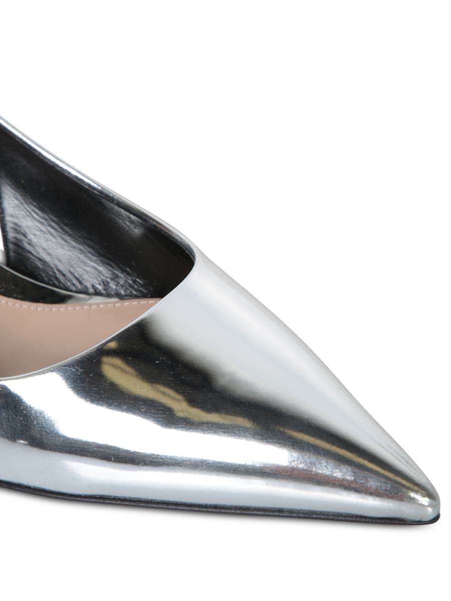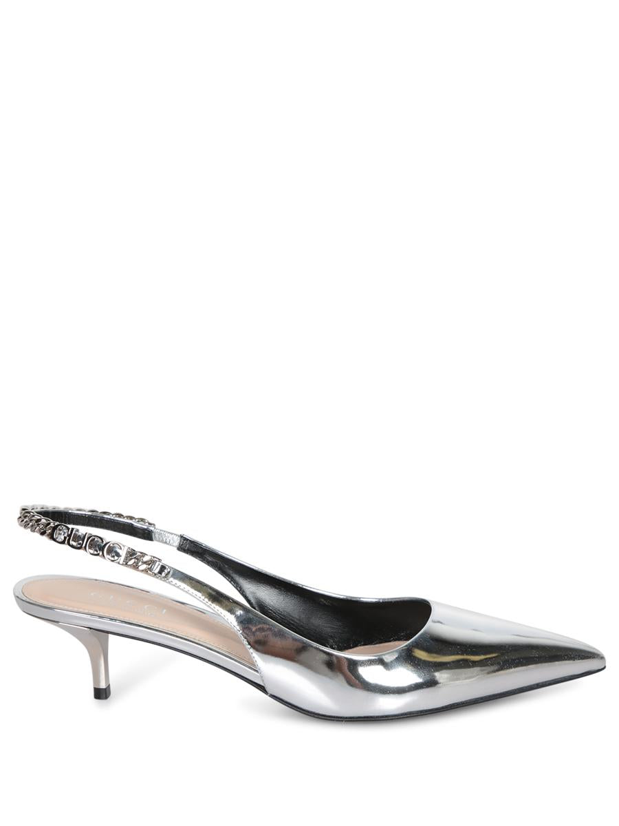 Silver metallic leather slingback. Medium sculpted heel. Ankle strap with logo detail.. This elegant Gucci slingback sandal, crafted from luxurious metallic leather, features a medium sculpted heel for lasting comfort and timeless elegance. The branded strap adds a sophisticated touch to the design