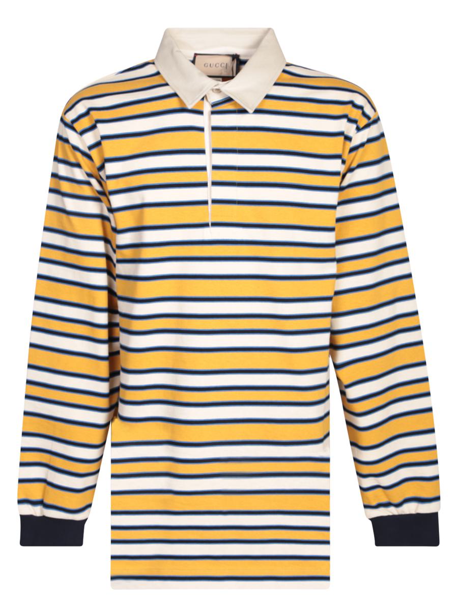 This striped polo shirt is a perfect representation of the unmistakable Gucci style. Classic collar. Long sleeves. Concealed button fastening. Striped design. Logo patch to the rear. Regular fit. Straight hem. Color: yellow/ multicolor
