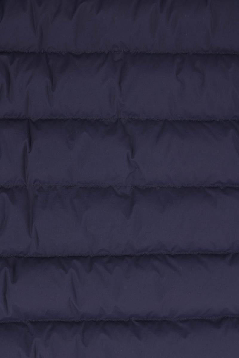 Herno padded jacket made of blue stretch nylon. Featuring a high collar, classic hood, front closure with double-slider zip, long sleeves, front pockets, elasticated trims, and a straight hem with drawstring. The design is completed by the unmistakable metal logo plaque applied to the hood.