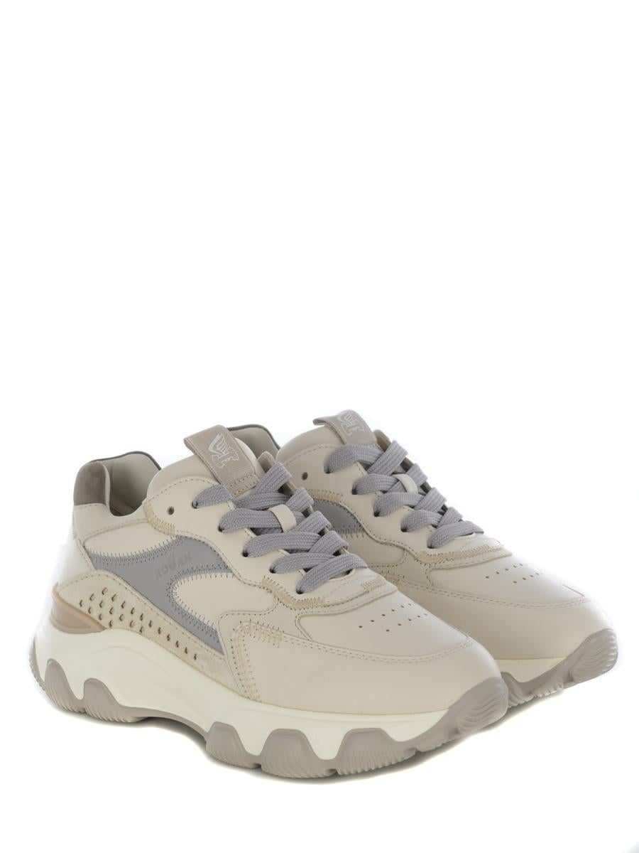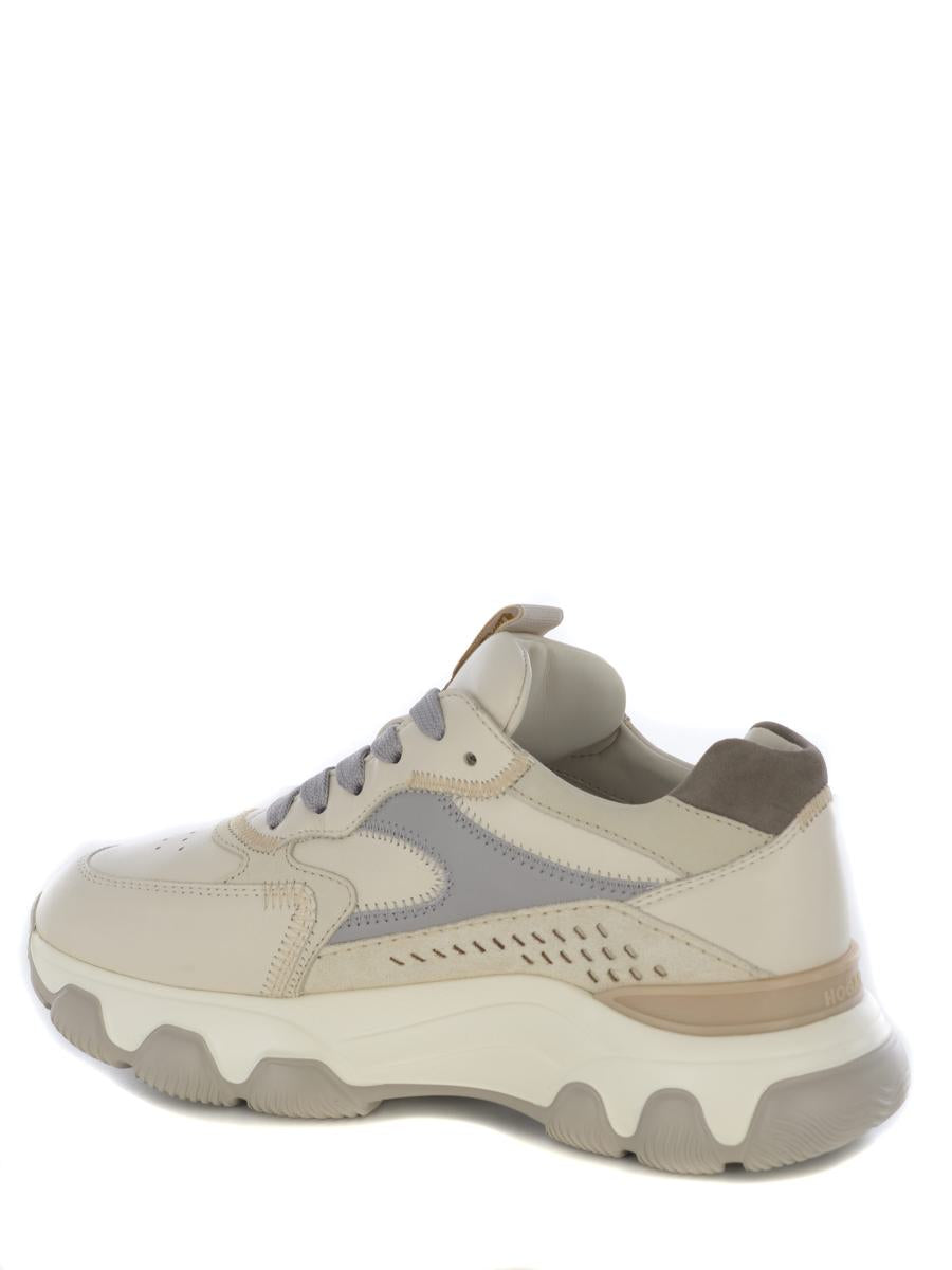 Sneakers Hogan "Hyperactive" made of Ivory leather. Nubuck details. Contrasting inserts in Grey. One-view stitching. Side perforation. Breathable round toe. Logo patch applied on the tongue. Lace-up. "Hogan" tone-on-tone logo lettering on the side. Memory foam footbed. Rubber sole, lettering on the back. 8mm raised footbed Total height 6.2cm Sole