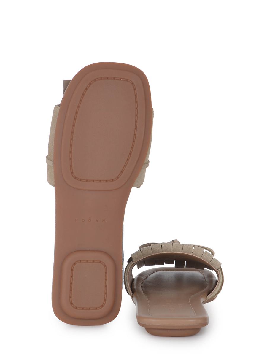 Hogan slippers made of Fango leather. Tan-colored leather interior with engraved logo. Suede upper band with tone-on-tone fringes. Silver logo "H" pendant on the band.
