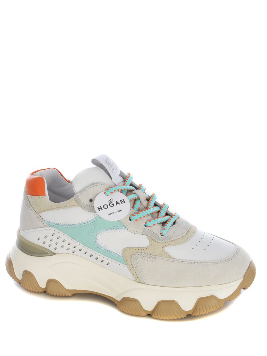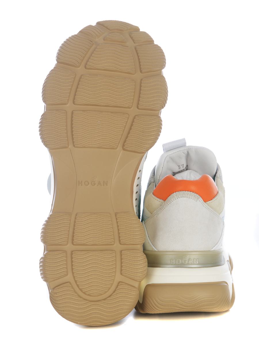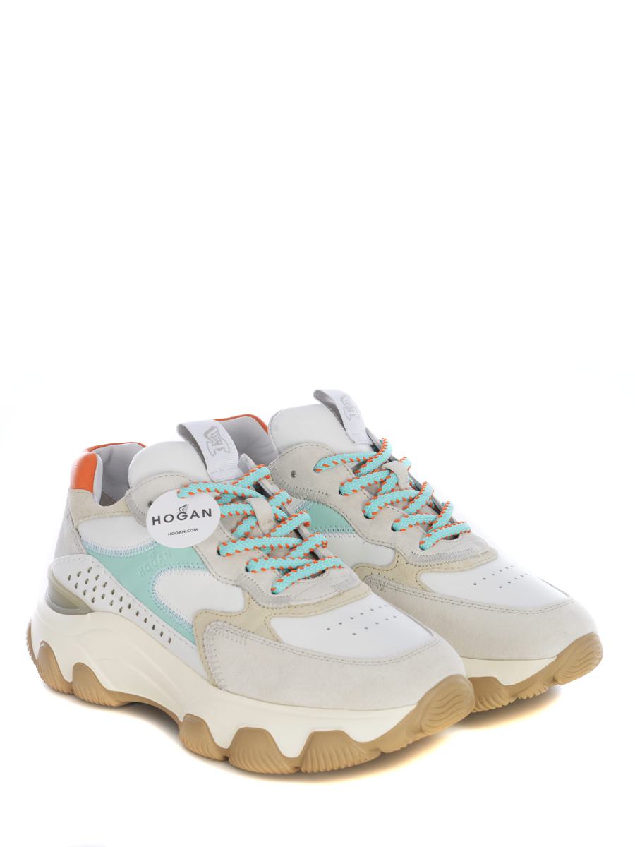 Sneakers Hogan "Hyperactive" made of White leather. Suede inserts. Stitch a view. Side drilling. Breathable round toe. Logo patch applied on the tongue. Laced. Contrasting laces Orange, Water Green. Water Green detail. Tone-on-tone "Hogan" logo lettering on the side. Orange contrasting heel. Memory foam fussbed. Rubber sole, writing on the back. 8mm raised fussbett Total height 6.2 cm