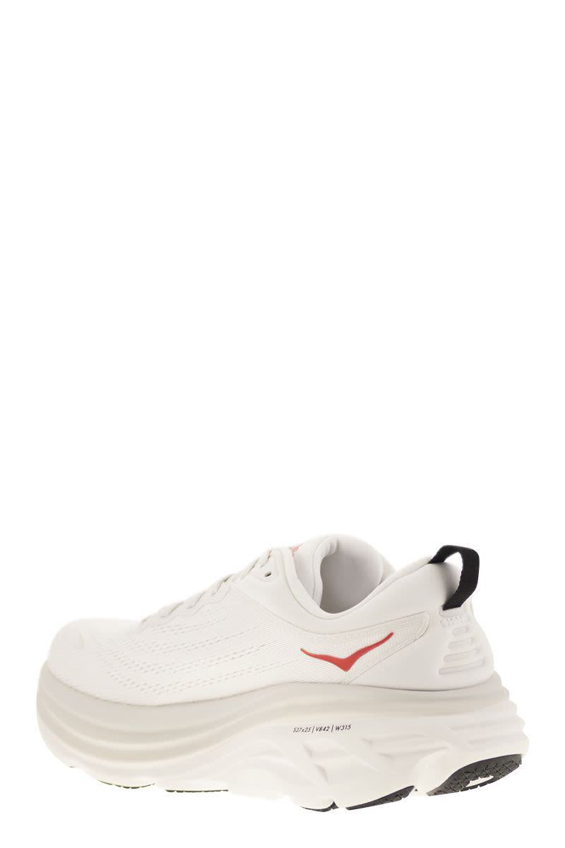 The ultra-damp revolution. One of the most durable shoes in the HOKA line, the Bondi has evolved dramatically this season: it has been reworked with softer, lighter foams and an all-new geometry with an expanded heel. With a ripple effect, the shock-absorbing cushioning at the rear ensures an incredibly soft and balanced wearing experience, from heel strike to forefoot transition. - Suitable for road and walking - Technical mesh construction - Partially gusseted tongue - Recycled polyester sockliner (40%) - Heel puller - Ortholite® hybrid insole - Lightweight, resilient foam - Zoned rubber positioning to save weight - Durabrasion Rubber outsole - Vegan model - Recycled polyester mesh upper (50%) - Recycled polyester strobel footbed (87%) - Recycled polyester sockliner upper (100%) - Laces in addition DESIGNER ID: 1123202 WVR