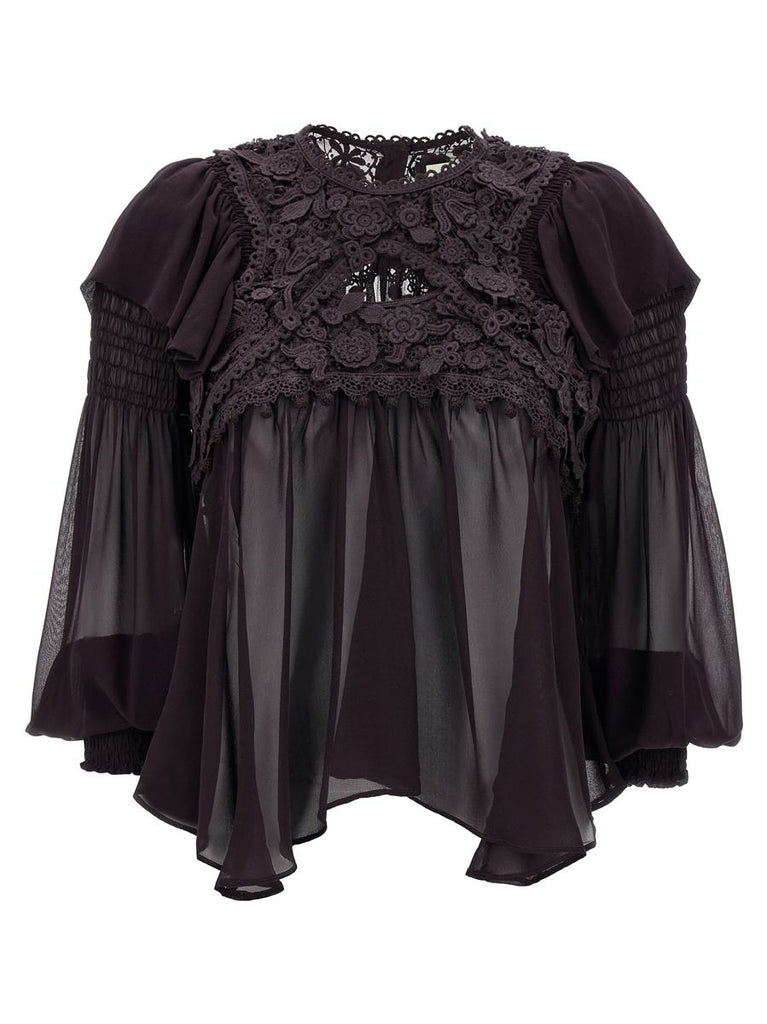Rokia' silk top with embroidery, round neckline, and long smock point cuffed sleeves