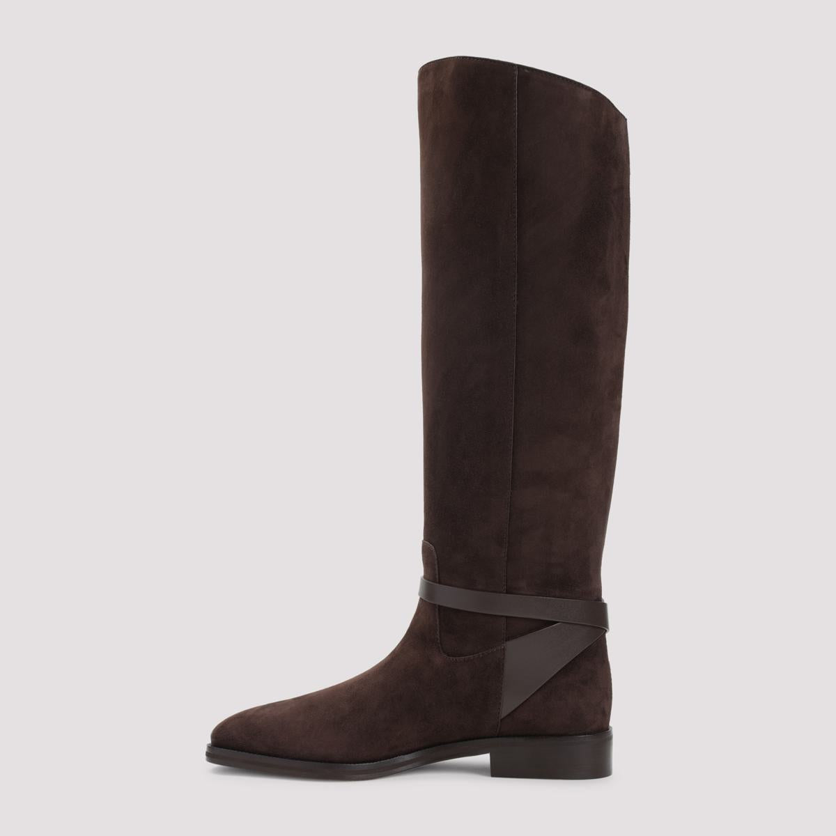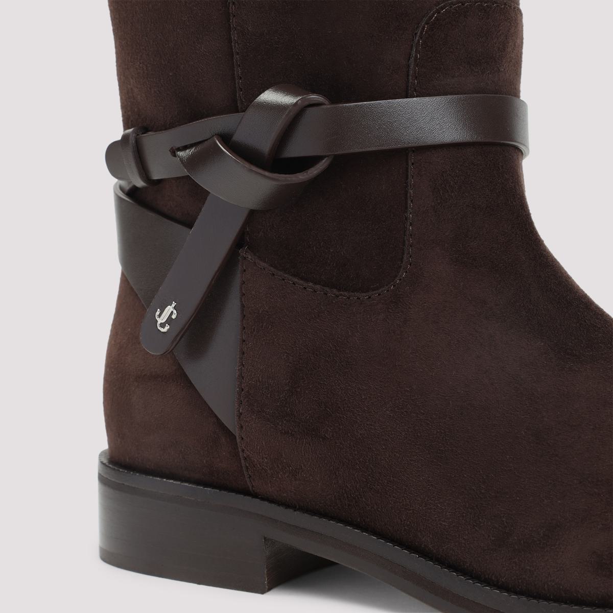 Jimmy Choo Chocolate Brown Suede Calf Leather Lawton Kb Flat Boots. Pure chocolate brown suede calf leather boots, round toe, knee-high, tonal ankle leather adjustable strap, side silver-tone signature JC logo, tonal sole.