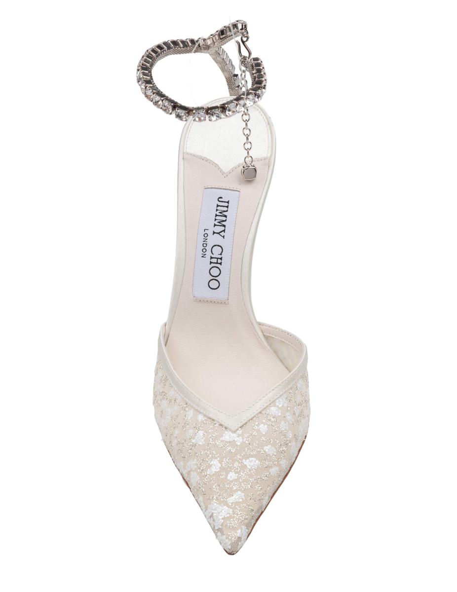 Mesh slingback with micro crystal appliqués Ivory color Crystal ankle strap Micro crystal appliqués on the heel Satin details Pointed toe Leather sole Leather insole Heel height 10 cm MADE IN ITALY