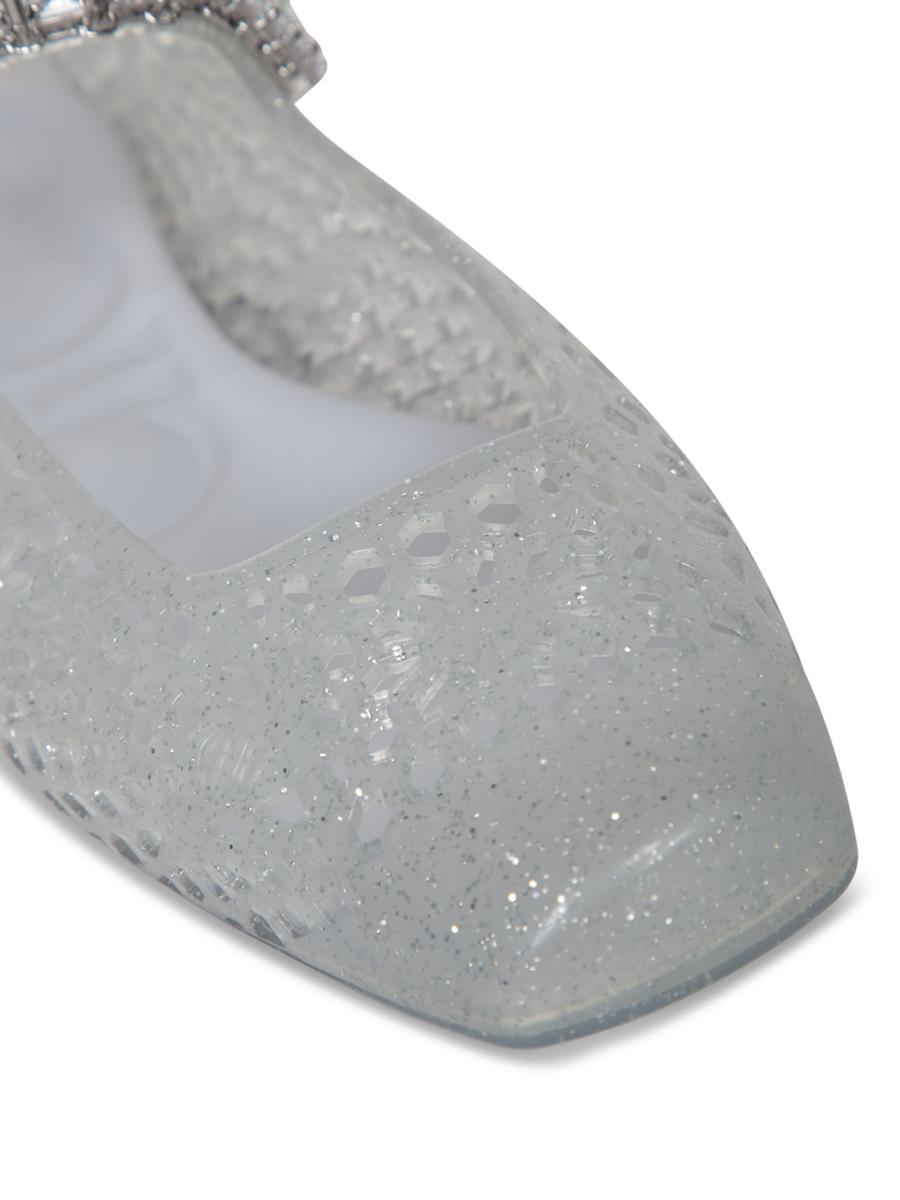 Slip-on design. Decorative bow with crystals. Glitter finish.. Redefine everyday elegance with Jimmy Choo's The Jelly ballerinas, adorned with a sparkling crystal bow atop glittery silver fabric. Perfect for adding a shimmering touch to every step