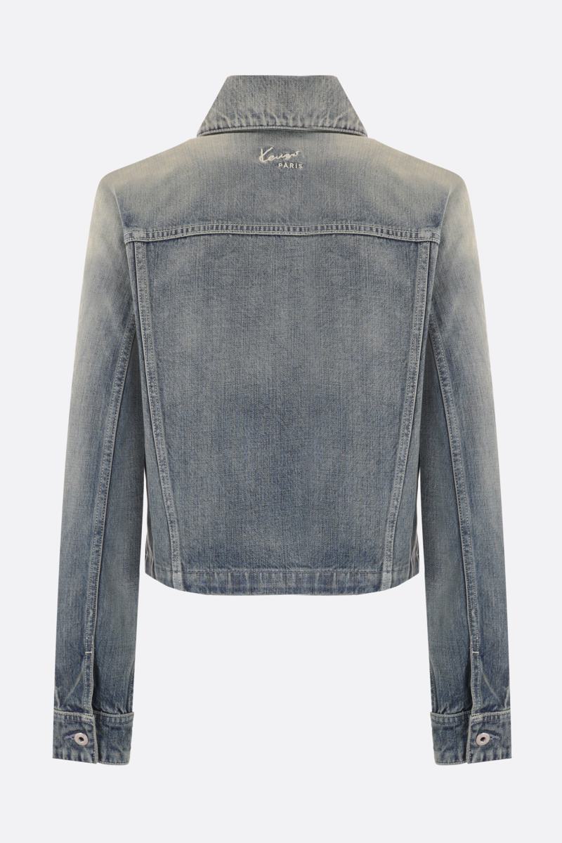 Kenzo's slightly cropped trucker jacket crafted in stone-washed light blue japanese denim with KENZO Archive logo embroidery at back. Featuring pointed collar, metal button closure, long sleeves with buttoned cuffs, front pockets and straight hem. Unlined interior.