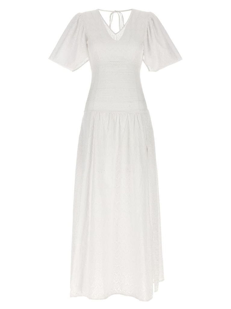 'Rosellina' broderie anglaise cotton dress with V-neck at the front and back, long sleeves with opening, wide side slits, pockets