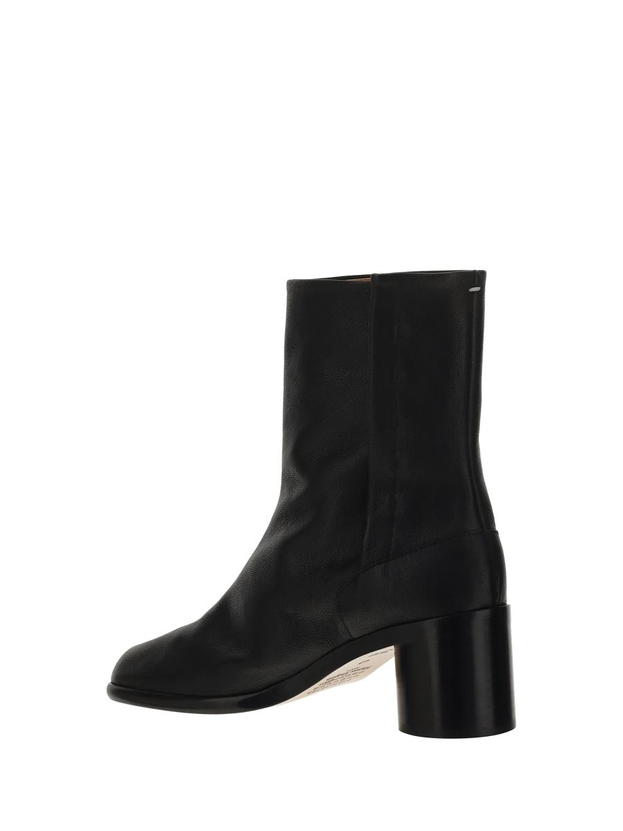 MARGIELA'S LEATHER TABI ANKLE BOOTS EXPRESS AN ICONIC AND DISTINCTIVE AESTHETIC, FEATURING THE FAMOUS TABI ALMOND TOE ON THE FRONT. THE ANKLE-HIGH DESIGN IS COMPLEMENTED BY A CYLINDRICAL HEEL THAT ENSURES STABILITY AND STYLE, WHILE THE INNER PANEL OPENING WITH INTERLOCKING BUTTONS ENSURES A PRACTICAL AND FUNCTIONAL CLOSURE.