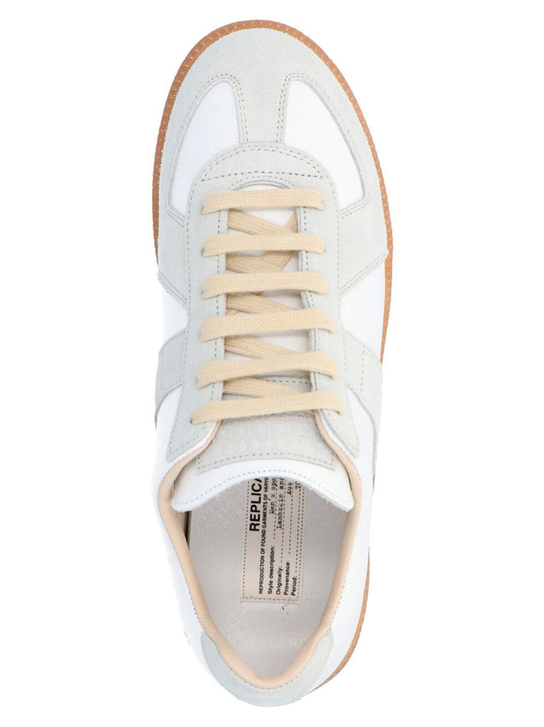 Maison Margiela "Replica" sneaker, constructed with nappa leather upper and suede inserts. Structure characterized by rounded shape and low profile, contrasting sole made of rubberized material with smooth finish. Visible stitching on side panel, flexible tongue with applied fabric label. Silhouette elements are reminiscent of sports shoes, with fabric lining and logo-printed insole.