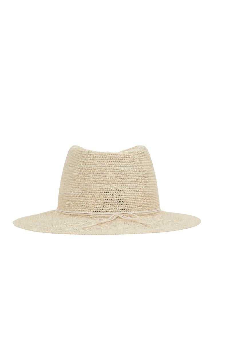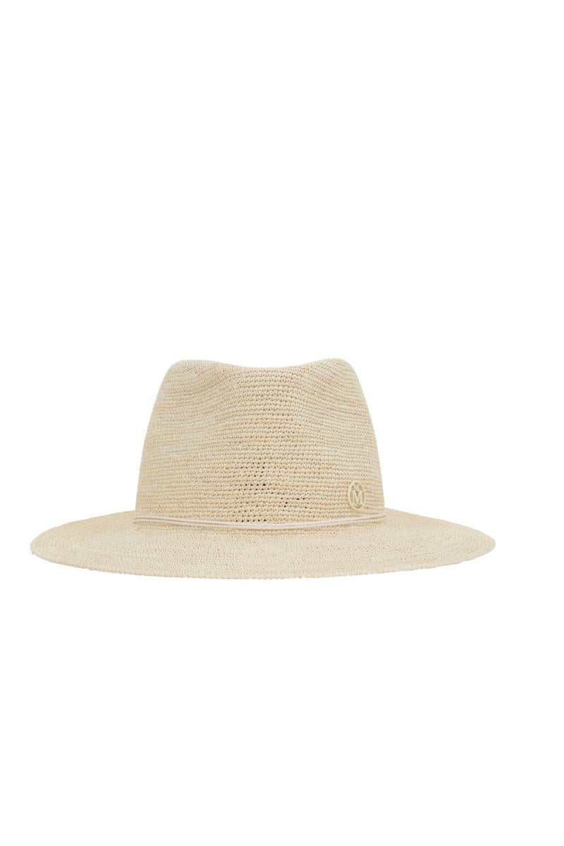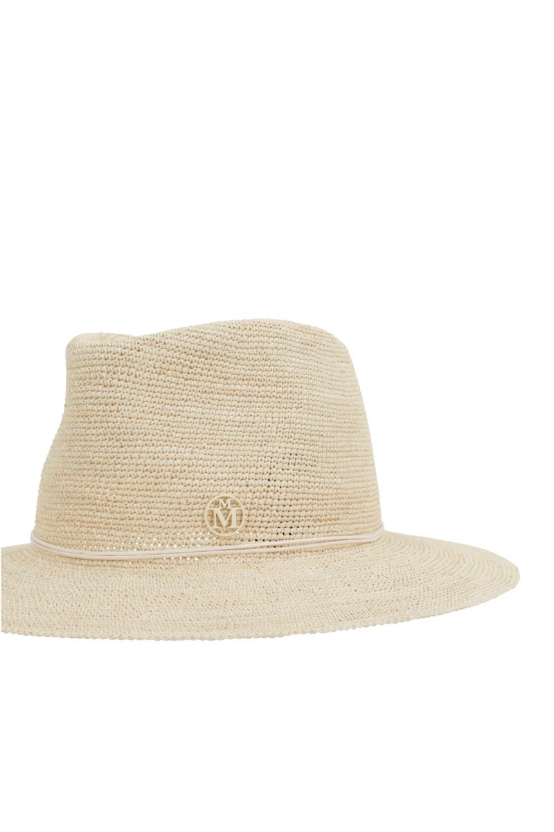 Maison Michel fedora hat crafted from natural-colored brisa and embellished with an ivory cord featuring a tone-on-tone metal logo.